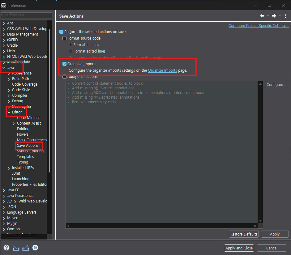 ✔ Organize imports 체크 후 Apply and Close 클릭